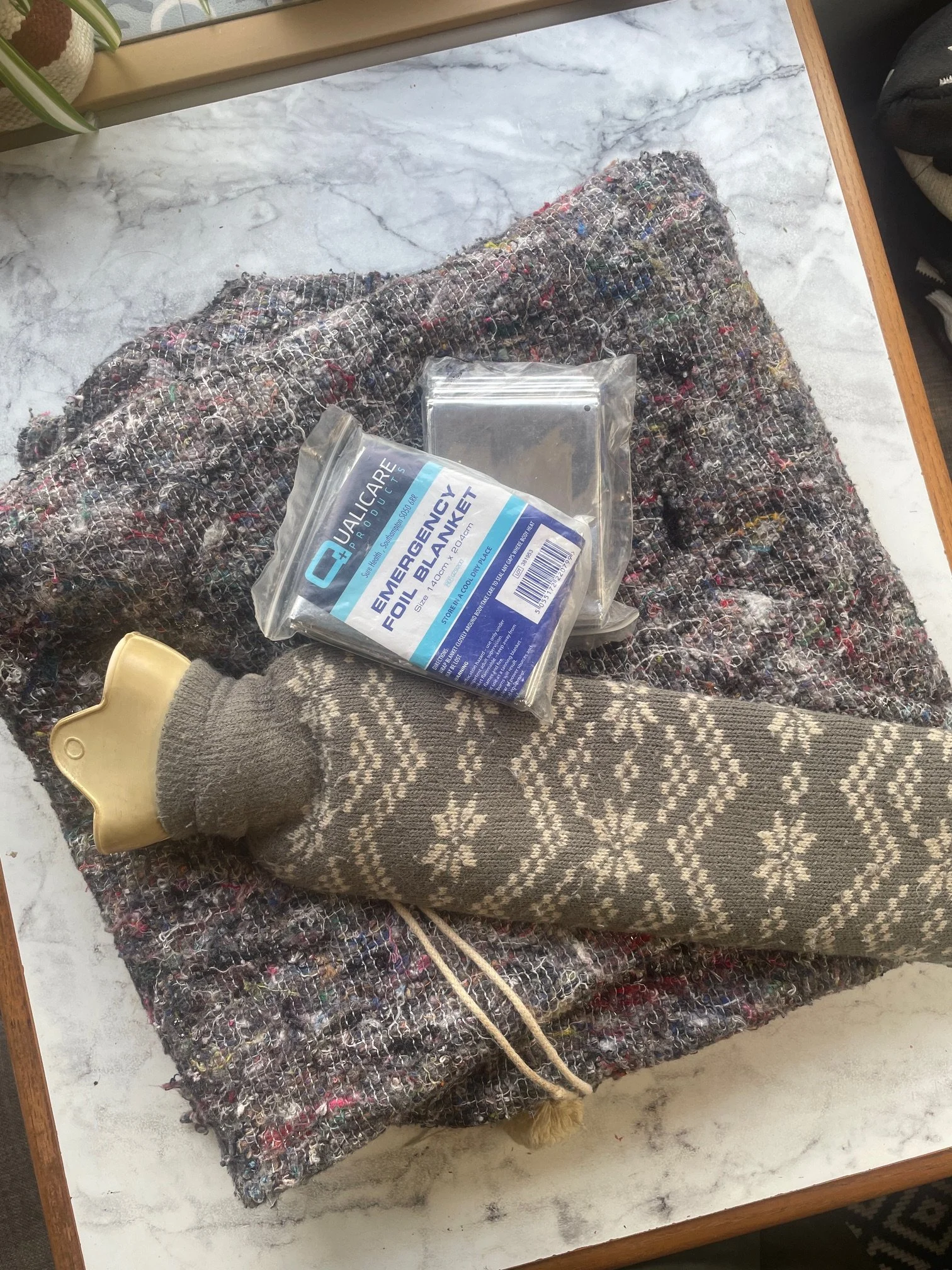 Blankets, sleeping bags, warm clothes, and hot water bottles are great for keeping warm. We also keep foil emergency blankets in our camper in case we get stranded in the cold.